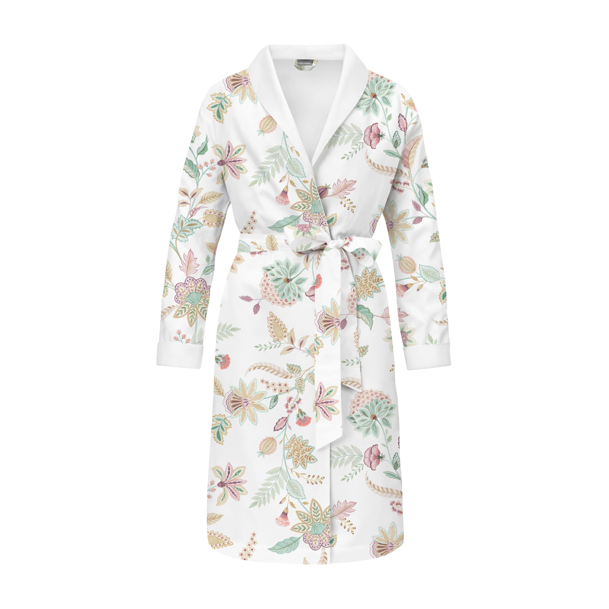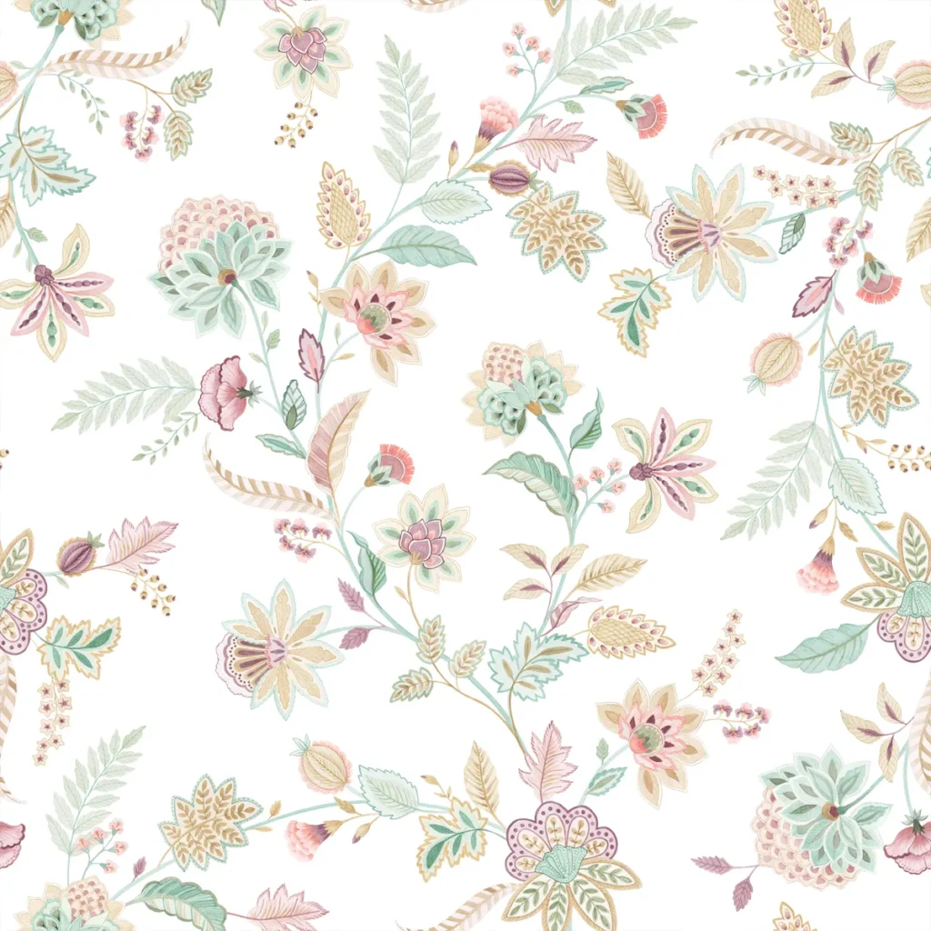 stilisierten Blüten und Blättern präsentiert sich in einer gedeckten, eleganten Farbstimmung aus Salbeigrün,